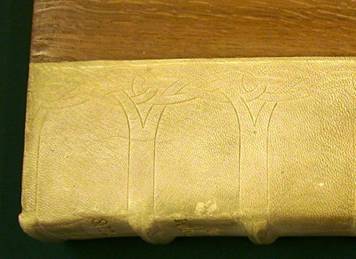 The V shaped lacing channels (picture 7) where the supports are laced through the wooden boards , have been hidden by an alum tawed hook guard/joint attached to the spine fold of the end leaves[2] and then pasted onto the inside board (picture 5).
