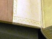 The spine and part of the boards had been covered with white alum tawed cape goat skin (quarter leather binding) and then decorated with a blind "interlaced"[1] decoration on the outside of the boards (picture 3) and on to the inside (squares) and edges of the boards (picture 4).