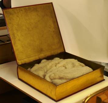 | 15: Open tin box with the vegetable fibres wrap that were used to protect the codex leaves during the move from Russia |